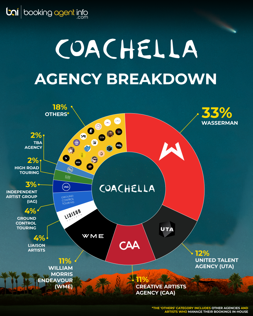 We wanted to see which agencies are behind the Coachella 2026 lineup, so we used Booking Agent Info’s music industry directory to find out who booked Coachella this year, and compared it to last year’s results. Here’s our 2026 Coachella agency breakdown: